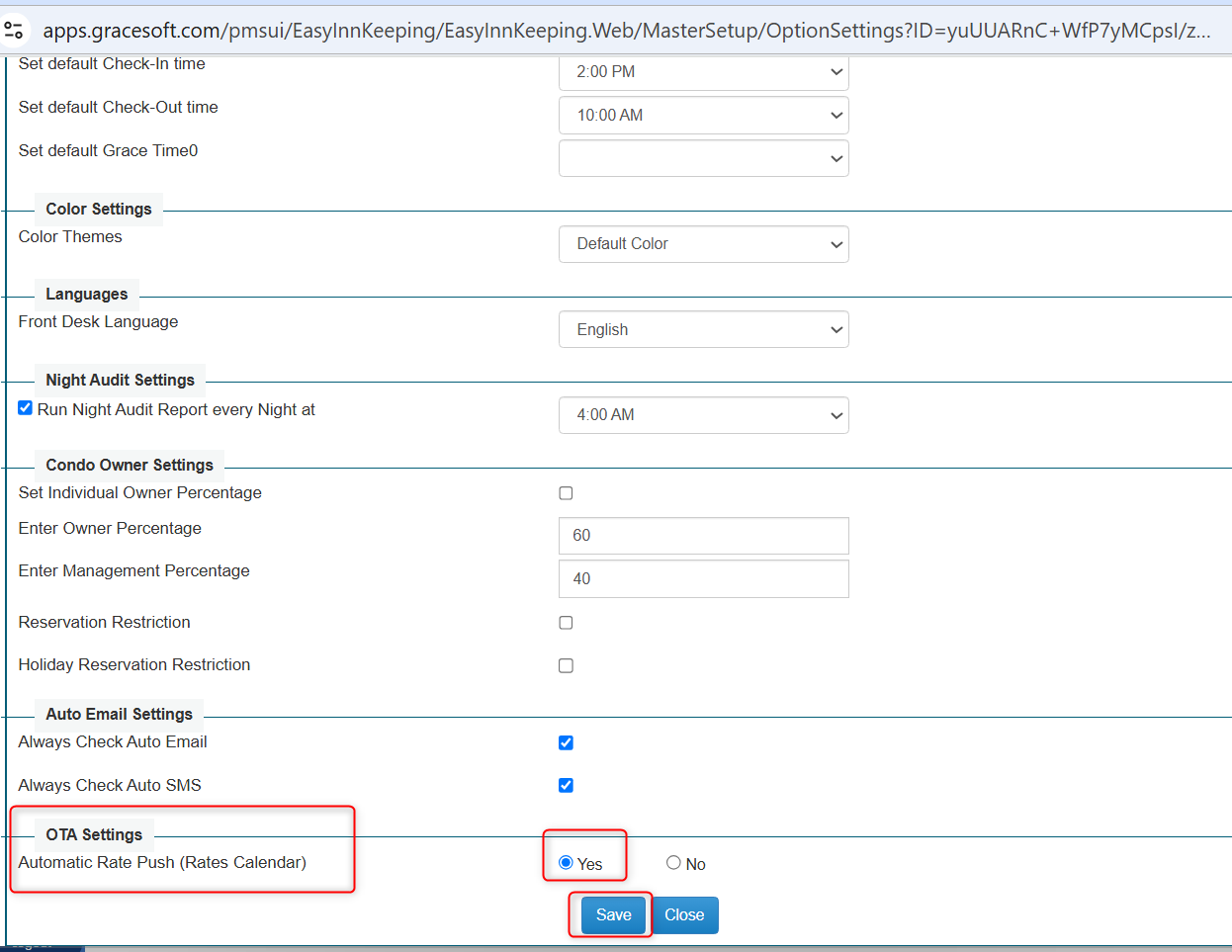 2. Scroll down to the bottom, under OTA settings->enable the "Automatic Rate Push(Rate Calendar) as "YES" and Save the changes.