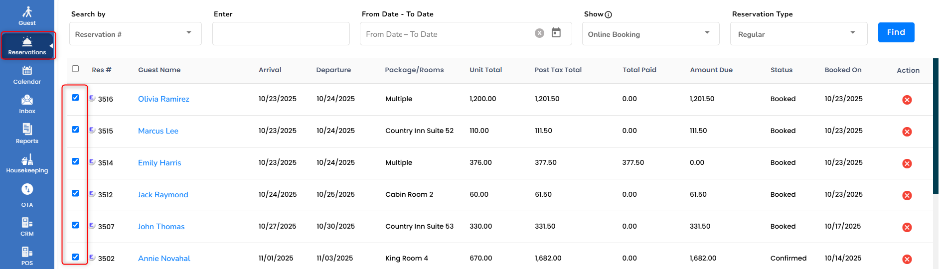 - Online Booking, It displays the reservations through online booking like booking.com, Expedia etc.