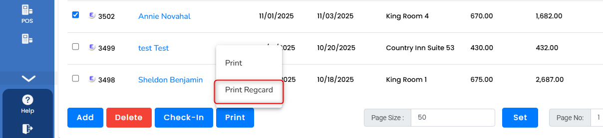 - Click on the checkbox behind the reservation number and press the “Print” button below. To print all reservations on the screen, click ‘checkbox’ next to Res#.